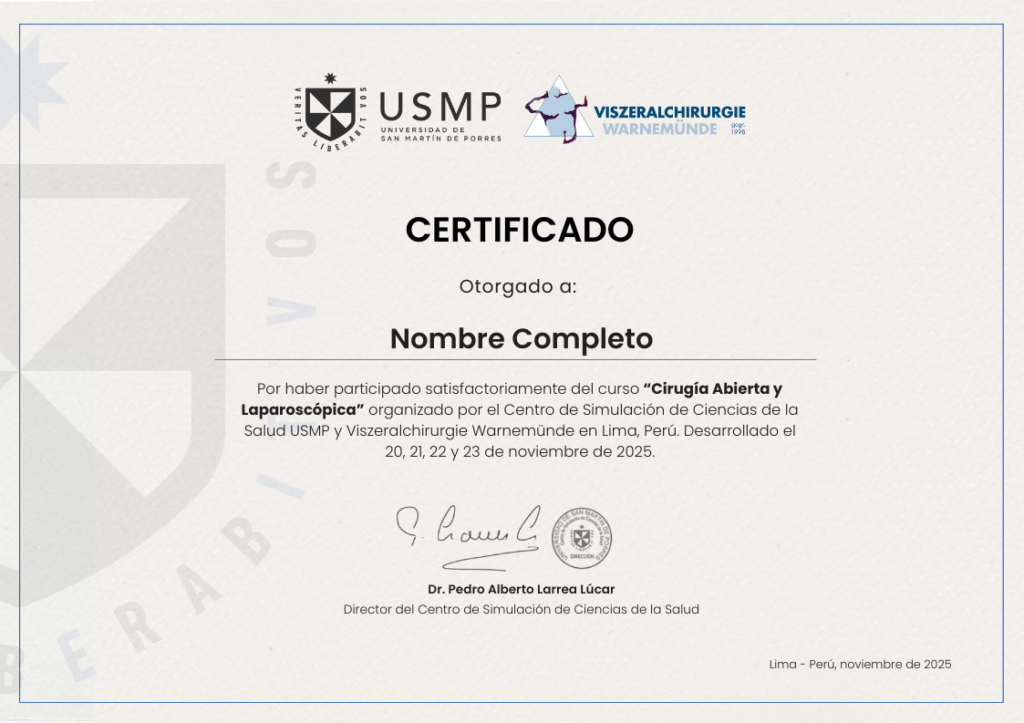 Organizado por Viszeralchirurgie Warnemünde (Alemania) y el Centro de Simulación de Ciencias de la Salud de la USMP (Perú), este curso intensivo tiene como propósito enseñar técnicas quirúrgicas estandarizadas internacionales.